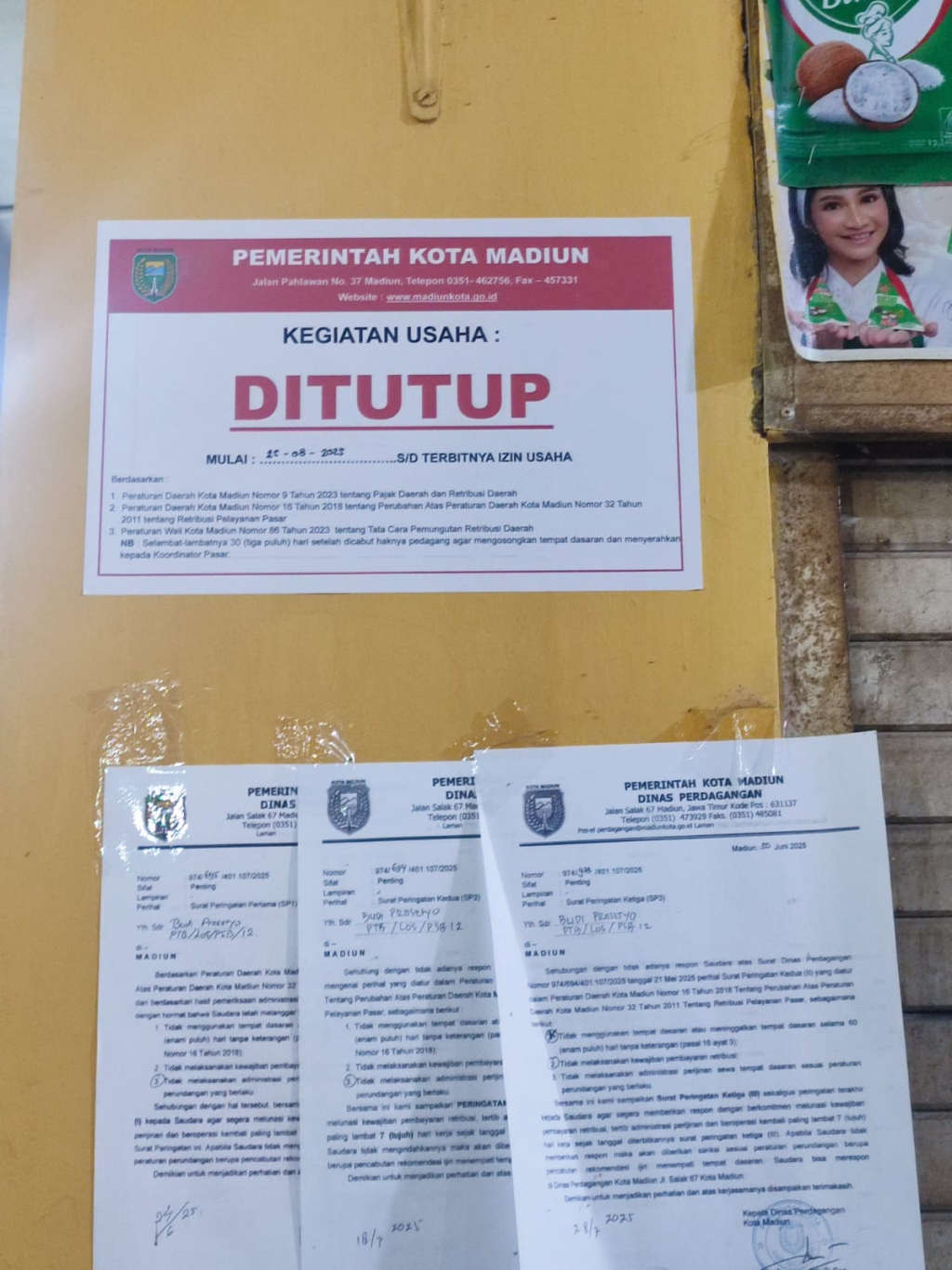 SP tersebut diberikan kepada pedagang yang dianggap melanggar ketentuan dalam Peraturan Daerah (Perda) Kota Madiun Nomor 16 Tahun 2018 tentang Retribusi Pelayanan Pasar.