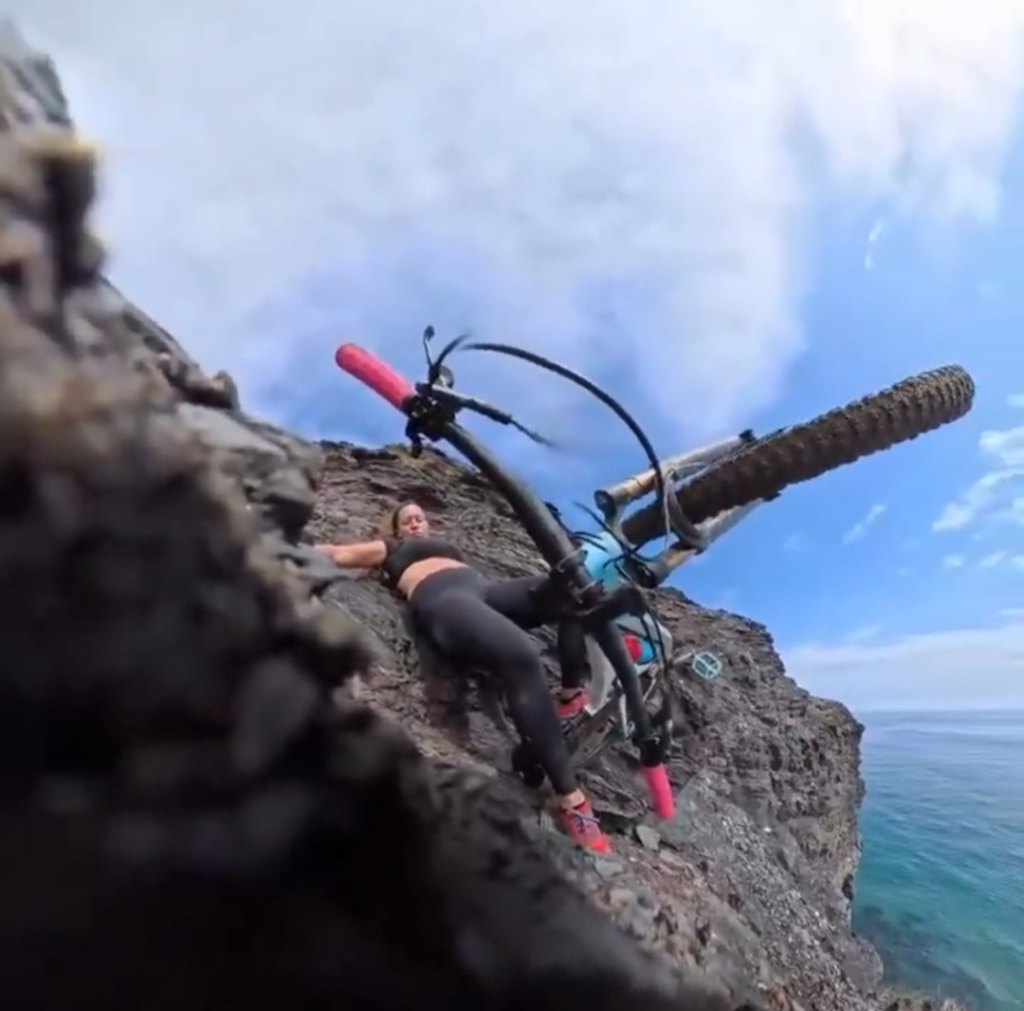 Dalam klip tersebut, yang telah ditonton lebih dari 5 juta kali, ia melambat hingga berhenti saat anjingnya mendekatinya di jalan setapak yang sempit, sebelum kehilangan keseimbangan di sepedanya dan terjatuh dari tebing.