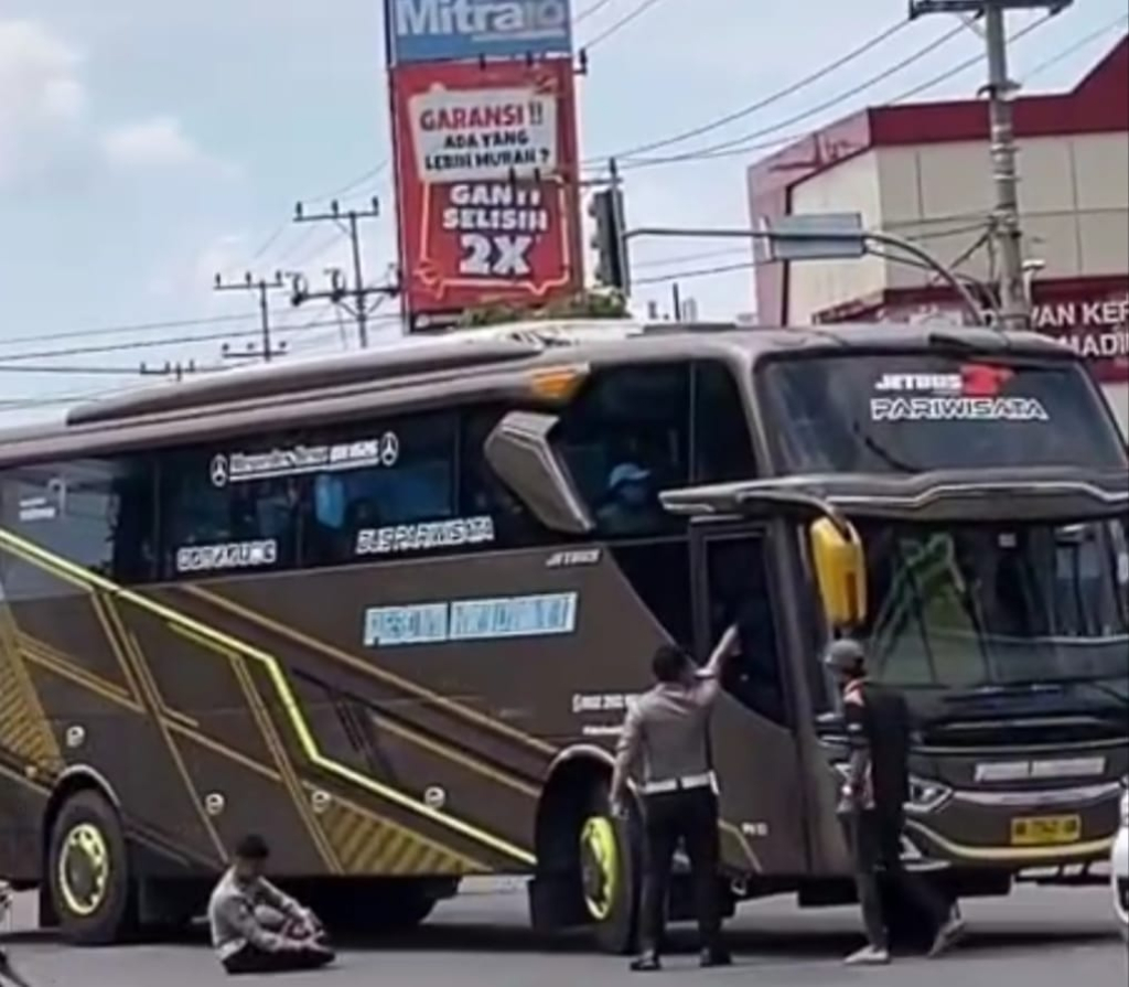 Peristiwa bermula ketika petugas mendapati sebuah bus pariwisata berwarna cokelat dengan nomor polisi AB 7542 UA melintas di jalur terlarang bagi kendaraan besar. Bus tersebut dikemudikan oleh A.A., warga Yogyakarta, yang diketahui melaju dari arah Ponorogo melalui Jalan Mayjen Panjaitan menuju Jalan Thamrin—ruas jalan yang secara aturan tidak diperbolehkan dilalui bus.