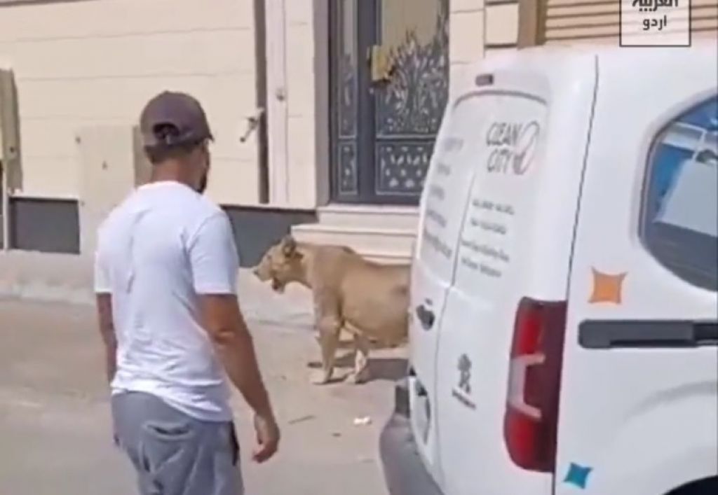 Sebuah video yang beredar di dunia maya menunjukkan jika singa itu berjalan di sepanjang trotoar. Dua orang yang kebetulan lewat hanya bisa menonton pemandangan itu.