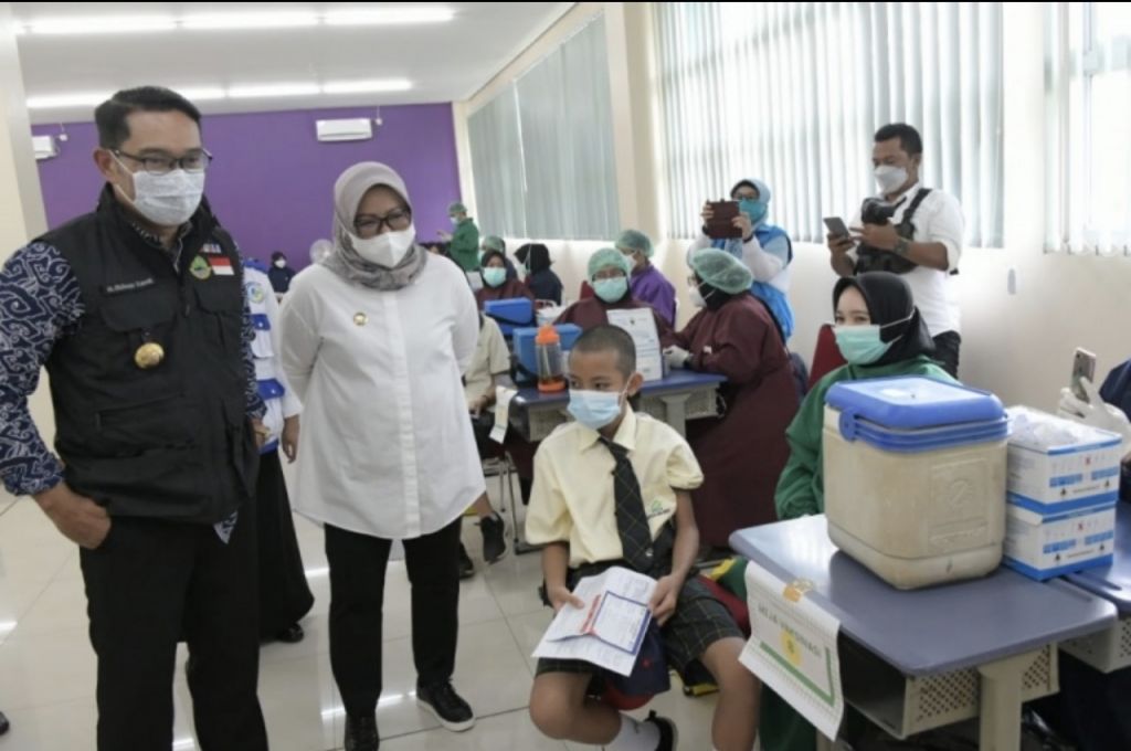 BOGOR (Realita)- Gubernur Jawa Barat Ridwan Kamil meninjau pelaksanaan vaksinasi massal COVID-19 dengan 10.000 dosis di Jonggol, Kabupaten Bogor.