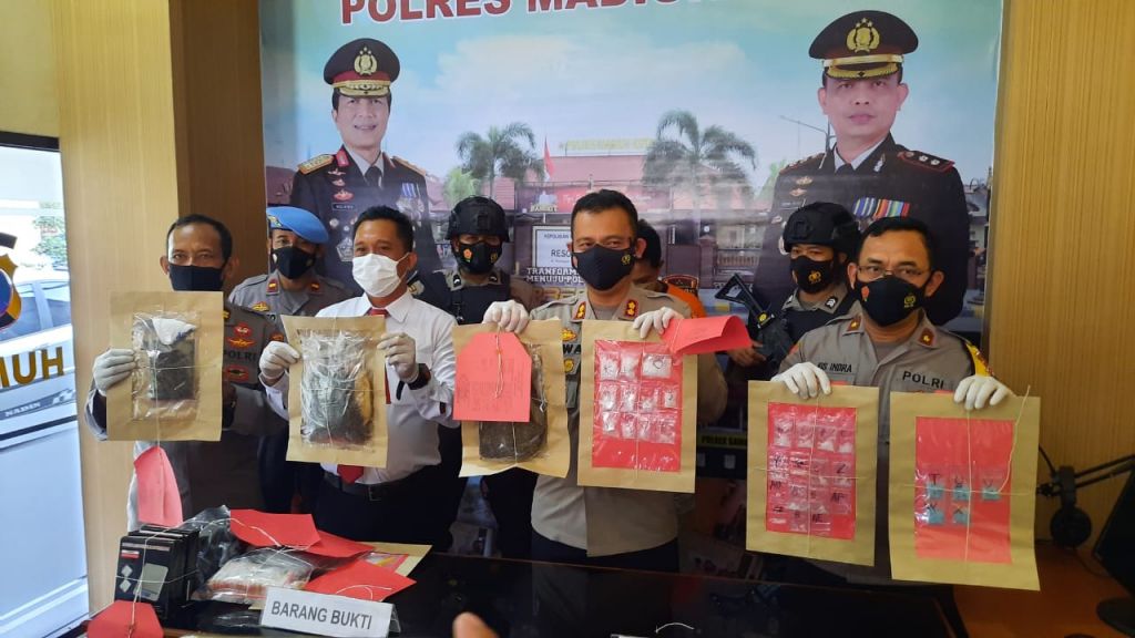 Kapolres Madiun Kota, AKBP Dewa Putu Eka Darmawan dalam konferensi pers mengatakan, tersangka berhasil diringkus di tepi jalan Tawang Krida Kota Madiun saat membawa narkotika jenis ganja seberat 588,25 gram, sabu 59,38 gram, dan ekstasi sebanyak 47 butir. Rencananya, barang haram tersebut akan dipecah untuk dijual secara eceran.