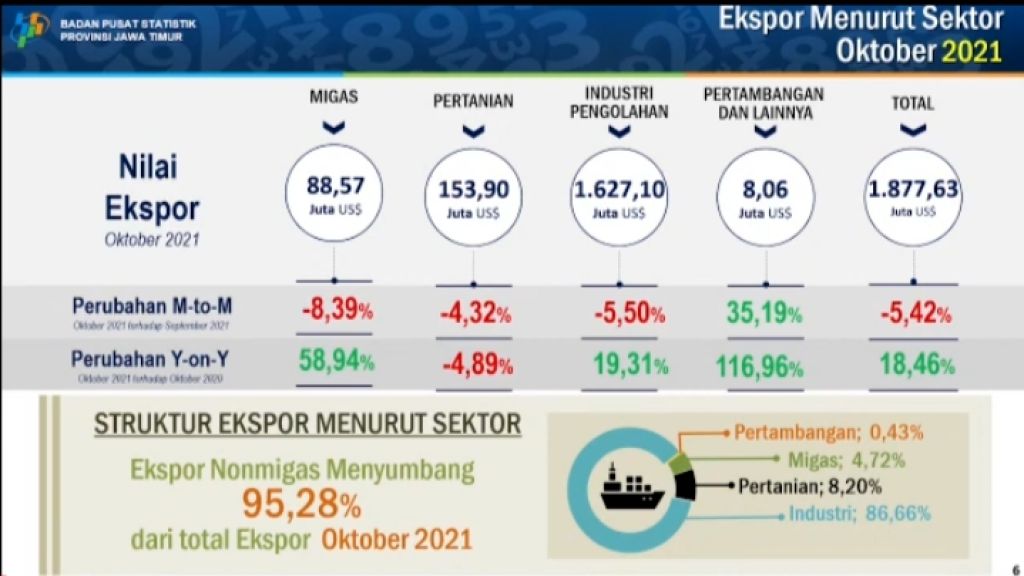 Akan tetapi, lanjut Dadang, dibandingkan Oktober 2020 nilai tersebut meningkat sebesar 18,46 persen. "Dibandingkan Oktober 2020, nilai ekspor Jawa Timur pada Oktober 2021 ini meningkat sebesar 18,46 persen," ujarnya, Senin (15/11/2021).