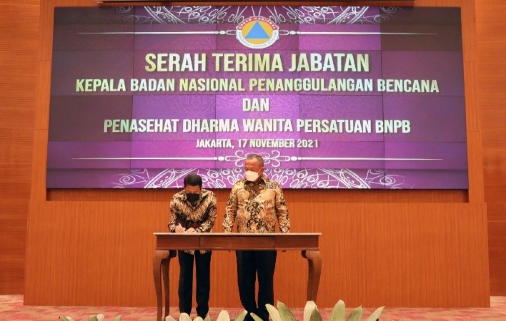 Serah terima jabatan tersebut dilakukan usai Presiden Joko Widodo melantik Mayjen TNI Suharyanto menjadi Kepala BNPB di Istana Negara, pada Rabu (17/11), menggantikan Letjen TNI Ganip Warsito yang sebentar lagi akan memasuki masa purna tugas. Atas pelantikan tersebut, maka Mayjen TNI Suharyanto menjadi Kepala BNPB ke-5 dari yang sebelumnya menjabat yakni mulai dari Mayor Jenderal TNI (Purn.) Prof. Dr. Syamsul Maarif, M.Si., Laksamana Muda TNI (Purn.) Williem Rapangilei, Letjen TNI (Purn.) Dr. (H.C.) Doni Monardo dan Letjen TNI Ganip Warsito, S.E., M.M.
