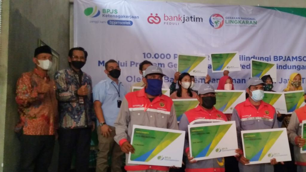SURABAYA (Realita) - Melalui program Gerakan Nasional Peduli Perlindungan Pekerja Rentan (GN Lingkaran) BPJAMSOSTEK, PT Bank Pembangunan Daerah Jawa Timur Tbk (Bank Jatim) kembali memberi perlindungan jaminan sosial ketenagakerjaan untuk 10.000 pekerja rentan.