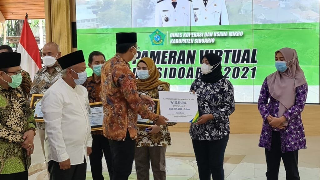 SIDOARJO (Realita) - BPJS Ketenagakerjaan (BPJAMSOSTEK) Sidoarjo menyerahkan manfaat program BPJAMSOSTEK di acara pembukaan Pameran Virtual Usaha Mikro Sidoarjo 2021 di Pendopo Sidoarjo, Jumat (19/11/2021).
