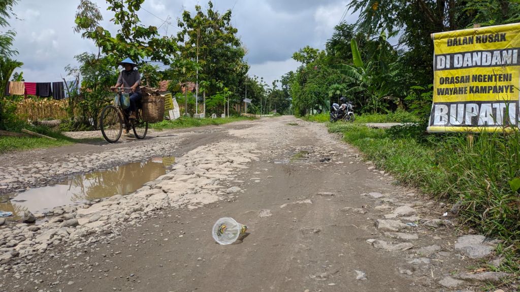 Tercatat, 10 banner berukuran 50 cm x 100 cm bejejer di pinggir jalan yang diklaim warga rusak sejak 2015 lalu itu. Berbagai tulisan sindiran pun di pasang warga untuk meluapkan kekesalanya akibat tak kunjung diperbaiki jalan antar kecamatan tersebut. Diantaranya, " Dalan Rusak Didandani Rasah Ngenteni Wayahe Kampanye Bupati", " Sabar Yo Bos Lewat Dalan Kene Dalan Ndeso Bedo Karo Dalan Kuto!", " Bayar Pajek Yo Ajek, Kerjo Bakti Yo Ngadek, Ning Nyapo Dalan Ku Bacek," tulis warga.