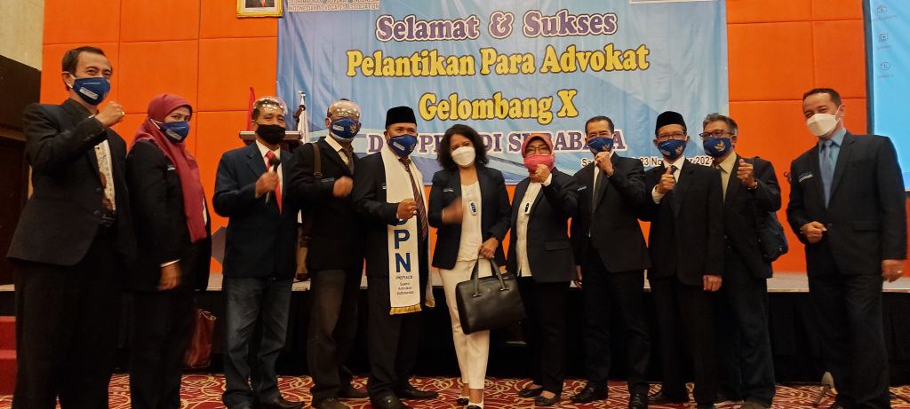 SURABAYA (Realita)- Dewan Pimpinan Cabang (DPC) Peradi Surabaya melantik 64 advokat di Hotel Santika Gubeng, Selasa (23/11/2021) malam. Puluhan advokat yang dilantik ini merupakan angkatan ke-10 sejak tahun 2018 sampai sekarang.