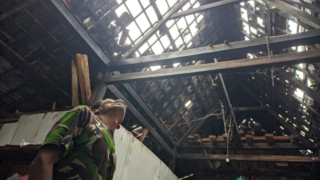 " Tiga atap kamar rumah saya rusak. Hampir tertimpa wuwung kalau tidak keluar. Diluar angin berputar-putar saya jadi takut," bebernya.