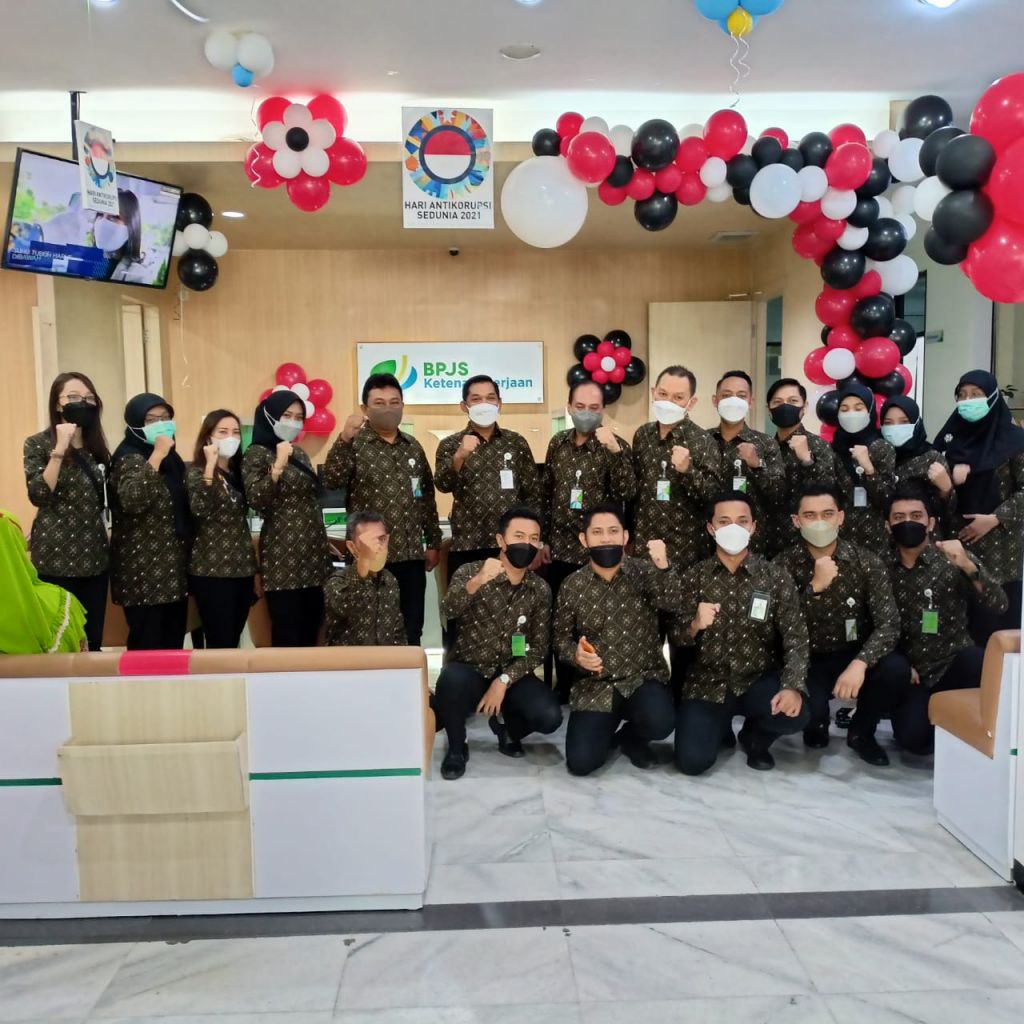 SURABAYA (Realita) - Memperingati Hari Anti Korupsi Sedunia (Harkodia) 2021, BPJS Ketenagakerjaan (BPJAMSOSTEK) Surabaya Rungkut mengajak seluruh peserta BPJAMSOSTEK, baik tenaga kerja maupun pemberi kerja untuk tidak coba-coba melakukan gratifikasi dan korupsi.