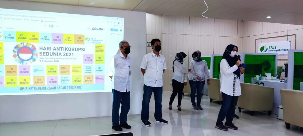 GRESIK (Realita) - Memperingati Hari Anti Korupsi Sedunia (Harkodia) 2021, BPJS Ketenagakerjaan (BPJAMSOSTEK) Gresik mengajak peserta BPJAMSOSTEK untuk membudayakan antikorupsi. Kegiatan ini dilakukan di kantornya, Kamis (9/12/2021).