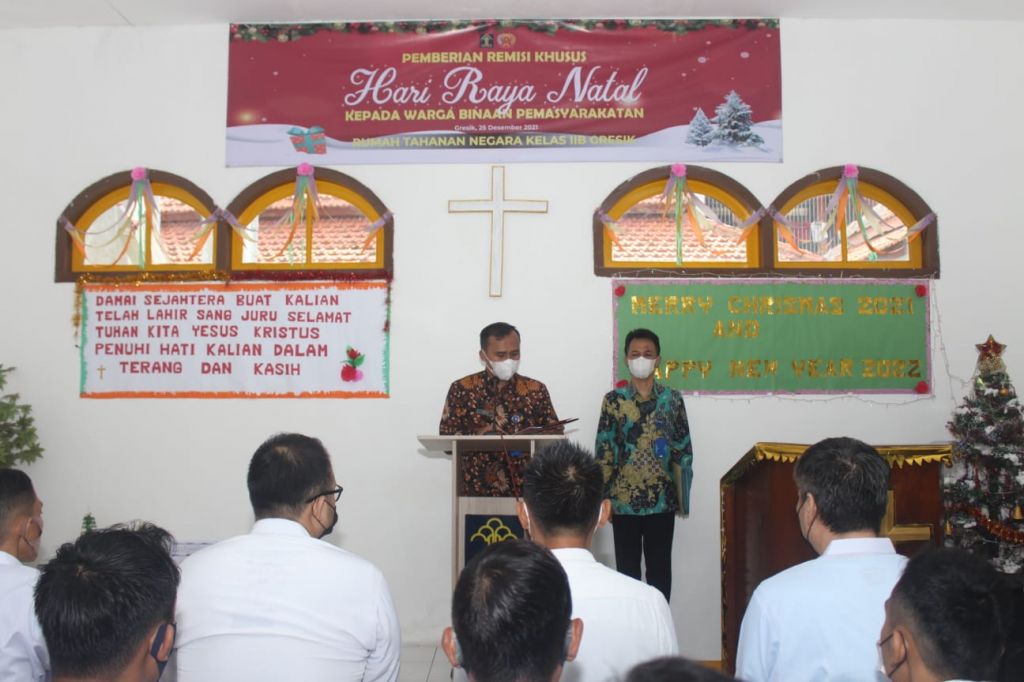 Bertempat di rumah ibadah Gereja Rutan, Aris membacakan sambutan dari Menkumham Yasonna Laoly saat penyerahan remisi secara simbolis pagi ini (25/12/2021).
