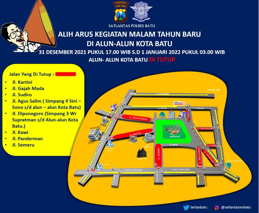 Kasat Lantas Polres Batu, AKP Indah Citra Fitriani mewakili Kapolres Batu mengatakan, beberapa ruas jalan di dalam kota dilakukan penutupan yang menuju Alun-alun Kota Wisata Batu pada malam pergantian tahun. Penutupan dimulai Pelaksanaan penutupan 31 Desember 2021 Pukul 17.00 Wib sampai dengan tanggal 01 Januari 2022 Pukul 03.00 Wib.