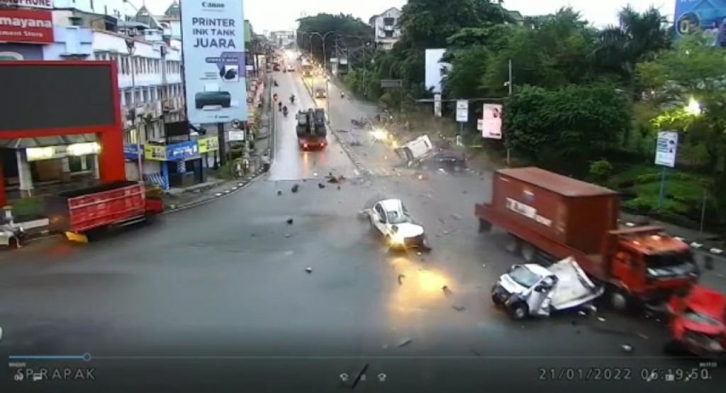 Alhasil, truk tronton menabrak sejumlah kendaraan. Berdasarkan pengamatan dari rekaman CCTV, setidaknya ada 7 mobil yang tertabrak. Sedangkan, sepeda motor tak begitu jelas terlihat.oke