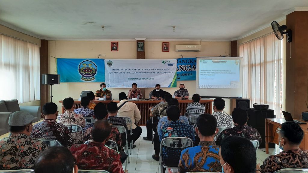 Langkah kongkrit sudah dilakukan BPJAMSOSTEK Madura bersama Dinas Perdagangan Kabupaten Bangkalan dengan mengadakan sosialisasi program BPJS Ketenagakerjaan ke para kepala pasar se-Kabupaten Bangkalan, Jumat (28/1/2022). Sosialisasi ini digelar di gedung Dinas Perdagangan Kabupaten Bangkalan, dihadiri Kepala Dinas Perdagangan Kabupaten Bangkalan, dan diikuti tidak kurang dari 25 kepala pasar se-Kabupaten Bangkalan.