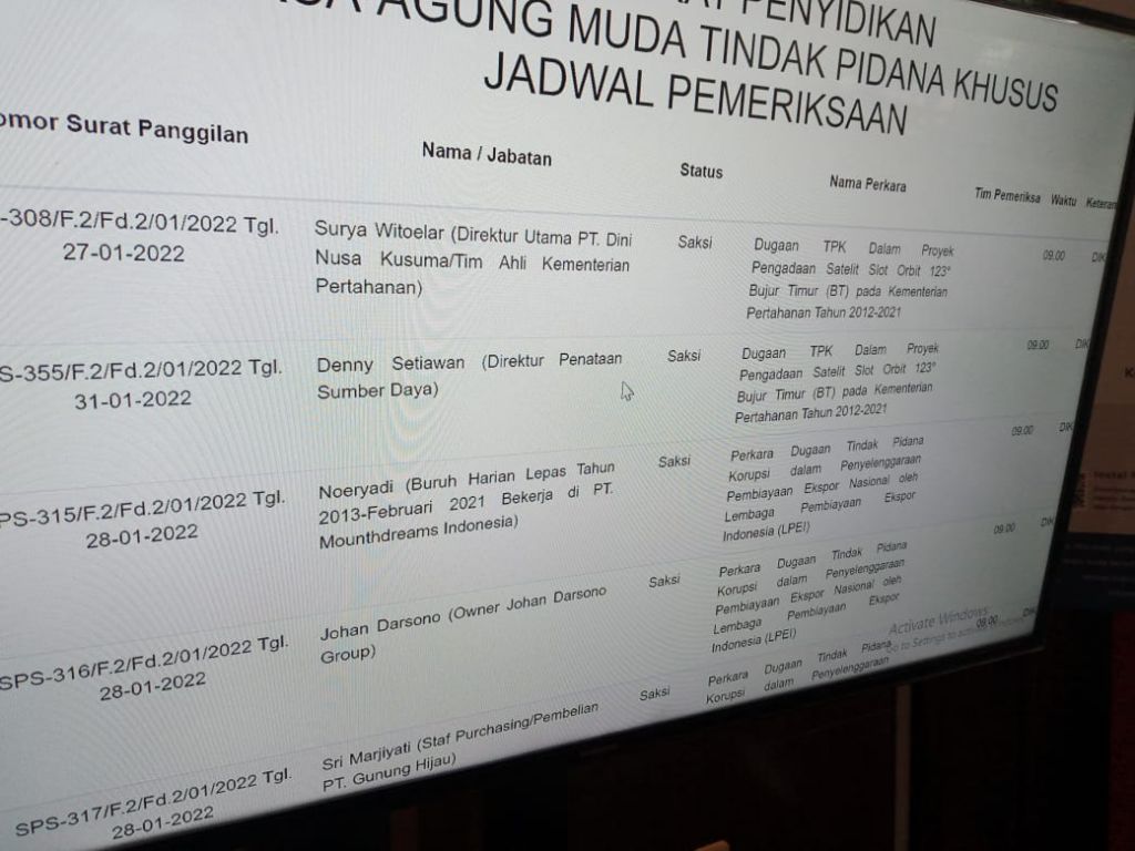 Berdasarkan pengamatan dari layar monitor pemeriksaan yang ada di gedung bundar terdapat nama Surya Witoelar pada Kamis (03/02/2022), sebelumnya Surya Witoelar sudah pernah diperiksa dua kali oleh penyidik.