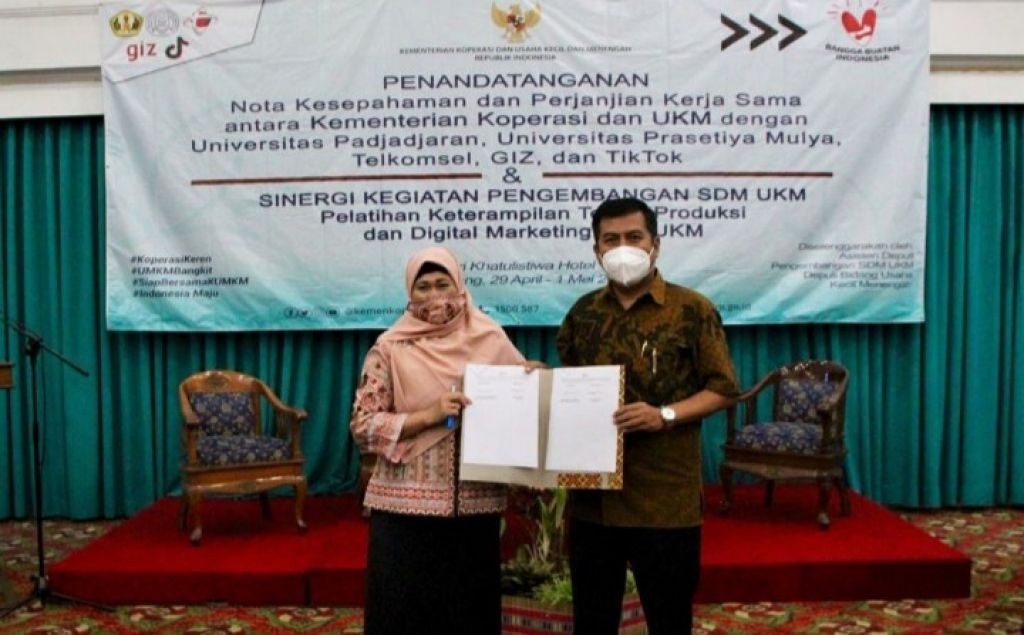 SUMEDANG (Realita) Guna meningkatkan kapasitas dan kapabilitas UKM di kabupaten/kota di Jawa Barat agar mampu Naik Kelas sekaligus mengarahkan untuk Go Digital, Kementerian Koperasi dan UKM melakukan penandatanganan Nota Kesepahaman (Memorandum of Understanding/MoU) dan Perjanjian Kerja Sama (PKS) dengan lima lembaga/Institusi yaitu Universitas Padjajaran, Universitas Prasetiya Mulya, Telkomsel, GIZ (Gesellschaft Für Internationale Zusammenarbeit) dan Tik Tok Pte Ltd, di Jatinangor, Sumedang, Kamis (29/4/2021).