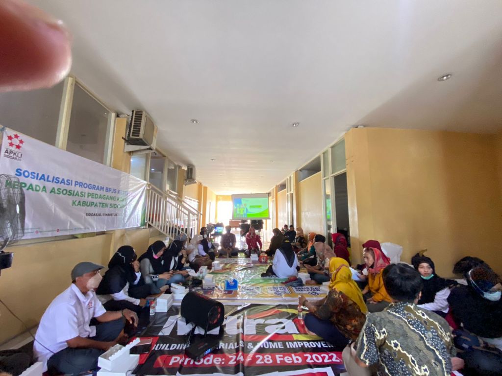 SIDOARJO (Realita)- BPJS Ketenagakerjaan (BPJAMSOSTEK) Sidoarjo kembali melakukan sosialisasi program dan manfaatnya kepada Asosiasi Pedagang Kaki Lima Indonesia (APKLI) Sidoarjo, di Sekretariat DPC APKLI Sidoarjo, Jumat (11/3/2022).
