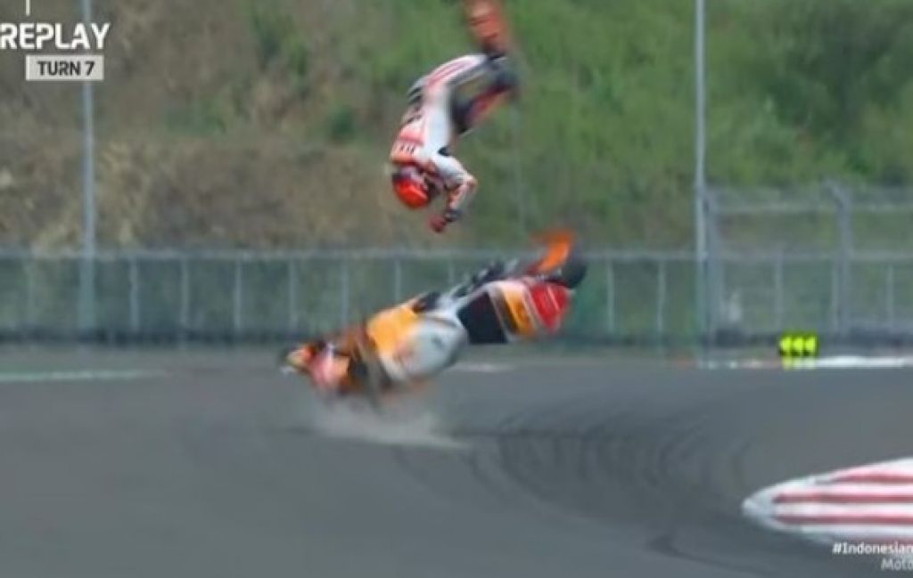 Dalam insiden tersebut, Marc Marquez yang hendak menikung di Turn 7 kehilangan kendali motornya. Ia pun lantas terpelanting ke udara, sementara motornya sempat berputar cukup lama di udara.