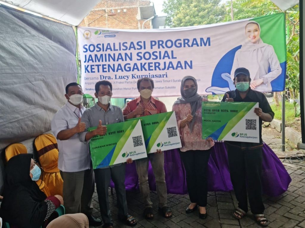 SURABAYA (Realita) - BPJS Ketenagakerjaan (BPJAMSOSTEK) Surabaya Darmo bersama anggota Komisi IX DPR RI Dra Lucy Kurniasari mensosialisasikan program Jaminan Sosial Ketenagakerjaan di Kelurahan Menur Pumpungan, Kecamatan Sukolilo, Surabaya, Jumat (1/4/2022). Sekitar 200 warga menghadiri kegiatan ini.