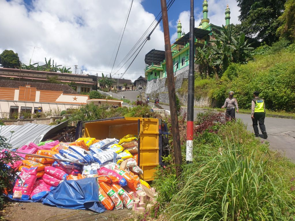 " Alhamdulillah saya selamat, kendaraan hanya menimpa warung kosong. Tadi ada satu kendaraan penggarap sawah yang tertimpa muatan pakan. Saat ini nunggu evakuasi dan kendaraan penganti dari Jombang," ungkapnya.