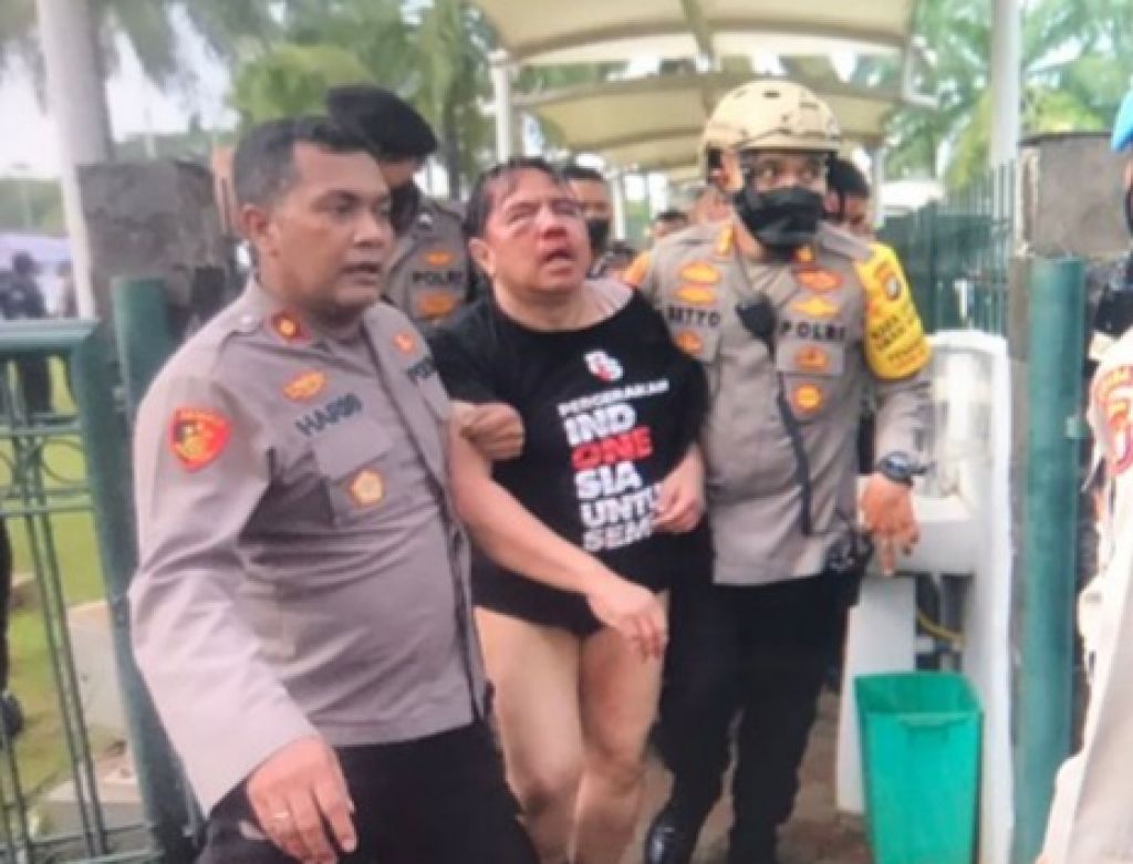 Ade Armando terlihat dipegangi sejumlah polisi. Wajah Ade Armando tampak bonyok.
