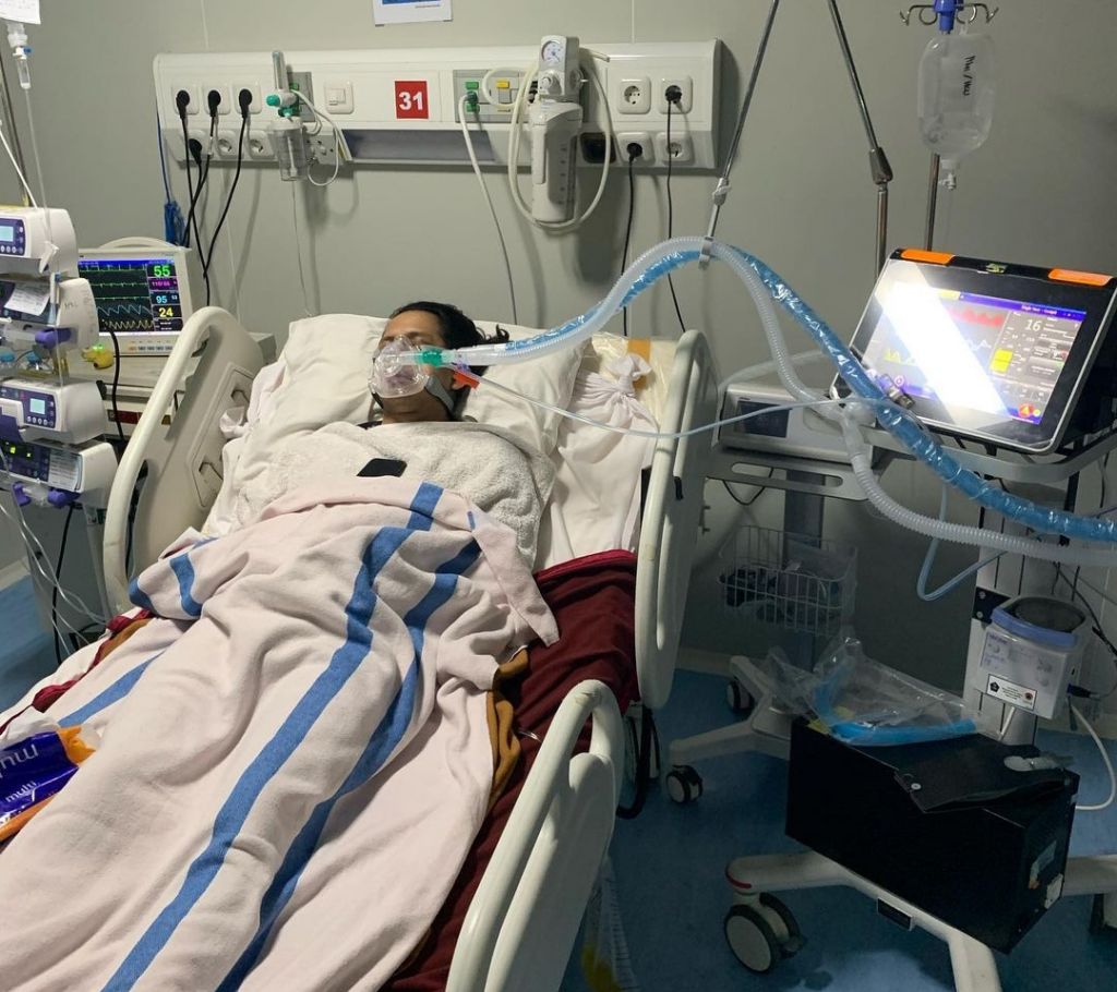 "Jadi sekarang suamiku posisinya masih di ICU, dibuat tidur karena memakai ventilator."