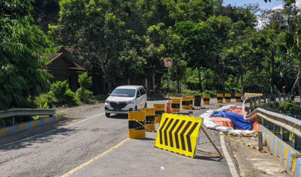 " Sudah satu bulan ini longsor, akibat taludnya tergerus air. Kami terpaksa menggunakan sistem buka tutup jalur, karena kendaraan dari arah barat selalu kencang, takut jatuh ke jurang yang longsor," ujar Sucipto (43) warga setempat yang bertugas sebagai petugas buka tutup jalur di lokasi ini, Senin (18/04/2022).