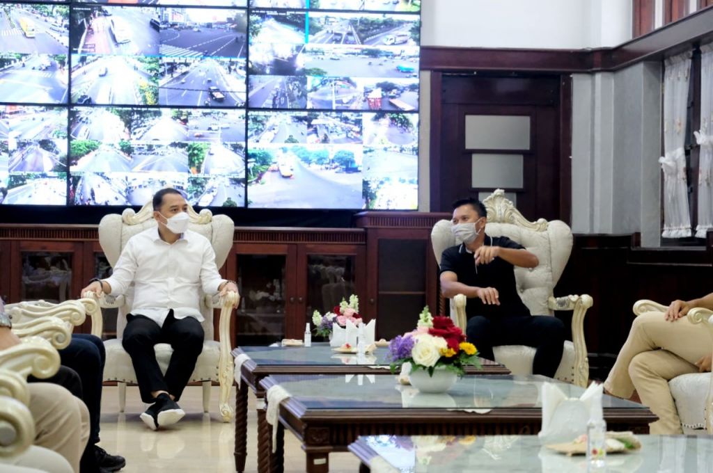 SURABAYA (Realita)- Wali Kota Surabaya Eri Cahyadi menyambut dengan hangat silaturahmi manajemen Persebaya dan panitia Bromo KOM di ruang kerja Wali Kota Surabaya, Balai Kota Surabaya, Senin (18/4/2022). Di ruang kerja itu, mereka nampak diskusi dengan gayengnya sembari membahas soal Persebaya hingga mematangkan trofeo Wali Kota Surabaya.