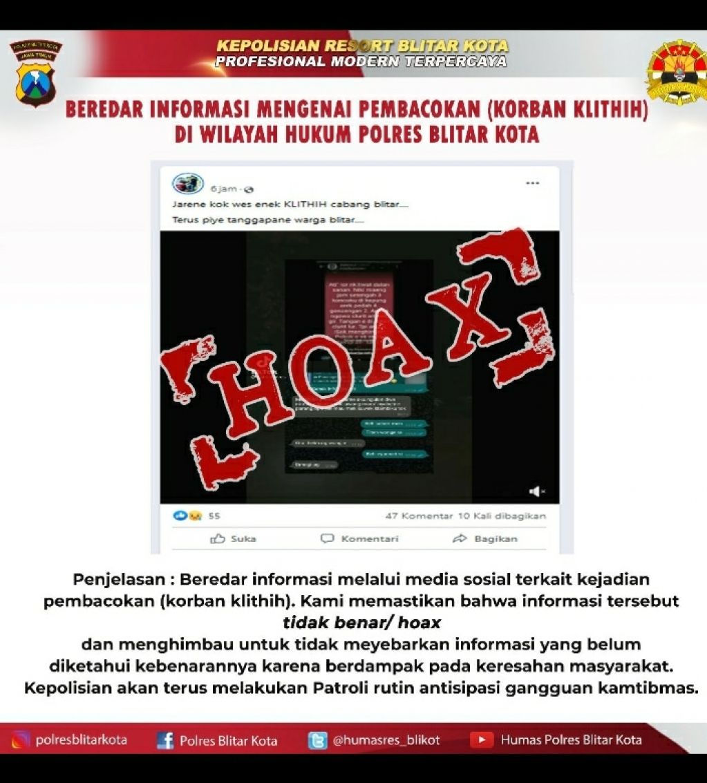 "Kami sampaikan terkait pemberitaan akhir-akhir ini soal adanya kejadian begal atau pembacokan yang terjadi di wilayah hukum Polres Blitar Kota itu merupakan berita hoaks," kata Kasi Humas Polres Blitar Kota, Iptu Ahmad Rochan, Selasa (19/4/2022).