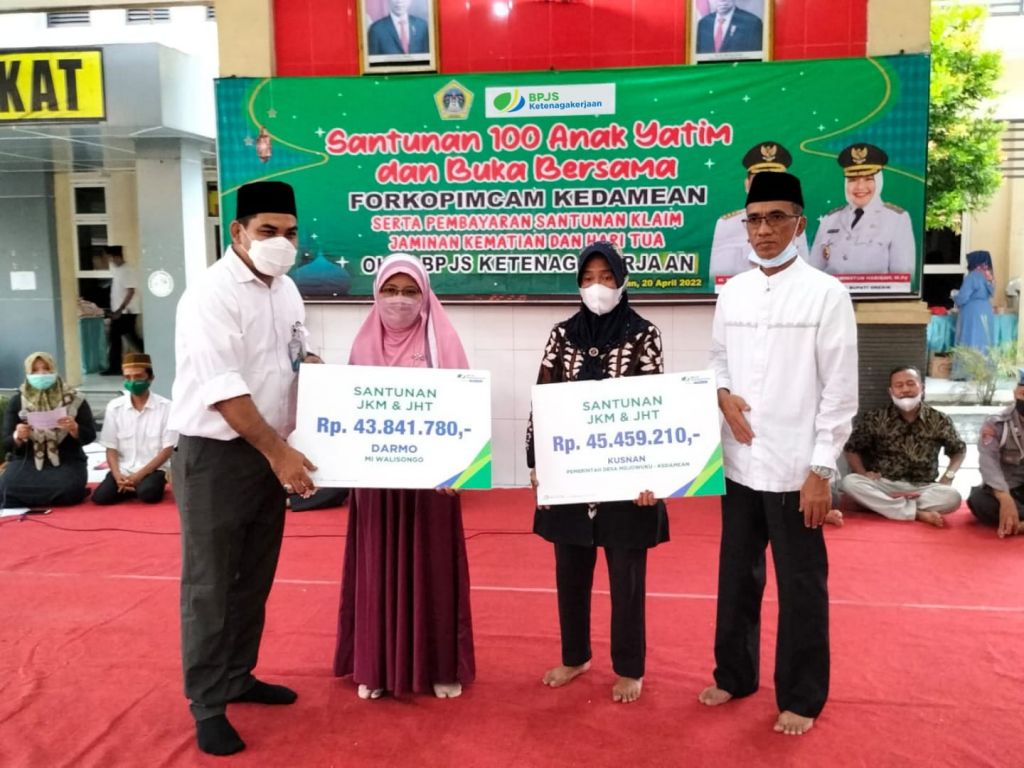 GRESIK (Realita) - Di tengah pemberian santunan kepada 100 anak yatim se-Kecamatan Kedamean, Kabupaten Gresik, BPJS Ketenagakerjaan (BPJAMSOSTEK) Gresik Driyorejo menyerahkan manfaat program Jaminan Kematian (JKM) dan Jaminan Hari Tua (JHT) kepada ahli waris 2 peserta BPJS Ketenagakerjaan yang telah meninggal dunia, Rabu (20/4/2022).