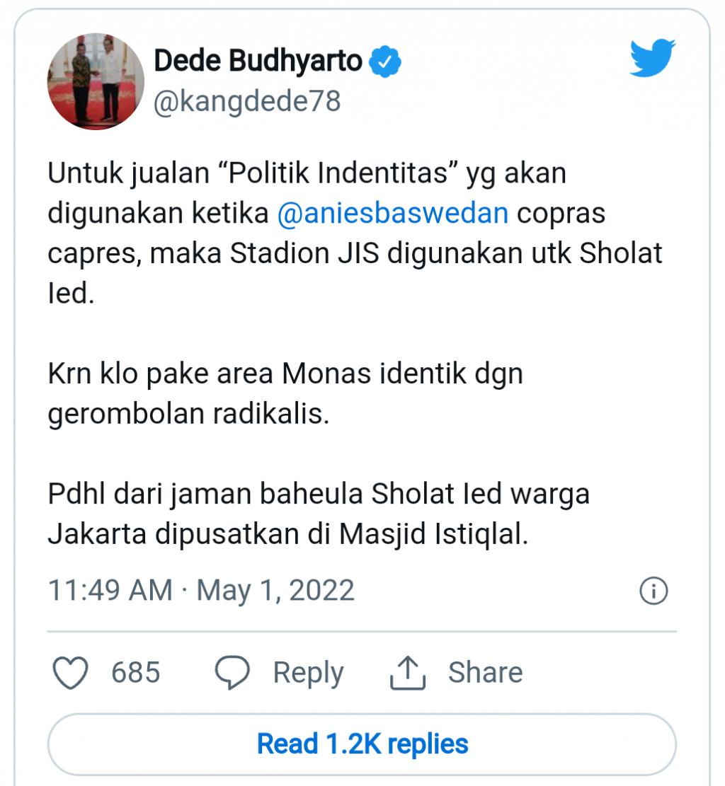 “Untuk jualan politik indentitas yang akan digunakan ketika Anies Baswedan mencalonkan presiden, maka JIS digunakan untuk Salat Idulfitri,” kata Dede di akun Twitter @kangdede78 dikutip pada Senin (2/5/2022).